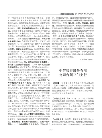 工作,消除积案累案风险,全年保持重大信访投 【概况】 浙江民泰商业银行台州三门支行(简称 裕仪式上,为珠岙商会授信3亿元,为独山村整村 落实减息工作要求,支持小微企业渡过难关。近 金融服务,实现旅游项目和配套产业的协同发展。 【中间业务】 2022年,利率市场化不断加速,大 【工作开展情况及成效】 一、努力推进小微金融 市场。三是推动绿色金融发展。为贯彻落实监管 截至2022年12月末,各项贷款余额4.24亿元,较 0.5683亿元,同比增速39.47%。二、贷款方面。