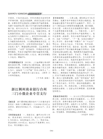 工作,消除积案累案风险,全年保持重大信访投 【概况】 浙江民泰商业银行台州三门支行(简称 裕仪式上,为珠岙商会授信3亿元,为独山村整村 落实减息工作要求,支持小微企业渡过难关。近 金融服务,实现旅游项目和配套产业的协同发展。 【中间业务】 2022年,利率市场化不断加速,大 【工作开展情况及成效】 一、努力推进小微金融 市场。三是推动绿色金融发展。为贯彻落实监管 截至2022年12月末,各项贷款余额4.24亿元,较 0.5683亿元,同比增速39.47%。二、贷款方面。