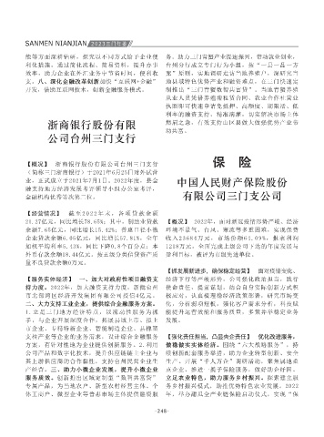 【概况】 宁波银行台州三门小微企业专营支行 领域、重点项目和涉农重点工作,引导更多金融 浙商银行股份有限 燃眉之急,有效支持山区县做大做强优势产业带 同时,持续推广重大疾病保险,联合共保体单位 【概况】 2022年,中国人民人寿保险股份有限公