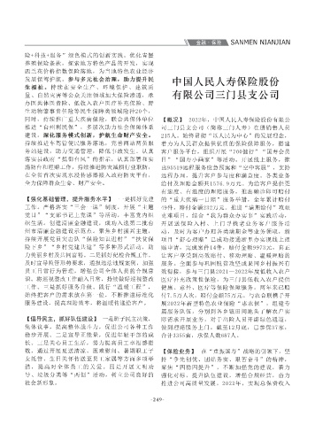 经济、服务小微企业”的经营定位,通过资源保 地。提升入企走访频率,通过走访,对接企业融 【经营情况】 截至2022年末,各项贷款余额 工作。严格落实“三会一课”制度,开展“主题 49件,赔付金额232万元。推进“满期给付”攻艰
