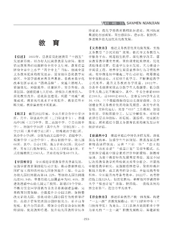 办幼儿园比例提高至44.22%,等级幼儿园比例提 料库,全面提升高考备考效率。2022年,高考特 2022年,全县共招聘新教师69名,公办幼儿园劳 流技师学院创建两大中心工作,深化教育教学改 【招生就业工作】 成立招生工作领导小组,制定 体、省教育科研“百强学校”、省教育科研先进 奖2人。本年度,县级及以上获奖论文48篇,其