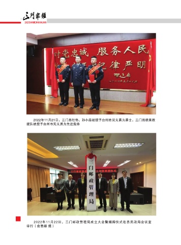 2023SANMENNIANJIAN 2022年11月21日,三门县杜伟、孙小藤被授予台州市见义勇为勇士,三门县雄鹰救 援队被授予台州市见义勇为先进集体 ̿̓ 2022年11月22日,三门邮政管理局成立大会暨揭牌仪式在县民政局会议室 举行(俞惠娜 摄)