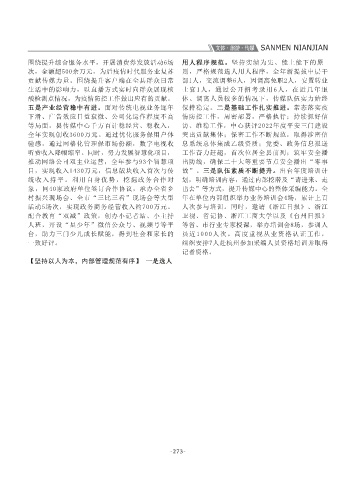 育健民目标,以三提三争竞赛活动为抓手,争先 走亲和戏曲进校园系列活动,继续开展周末剧场、 【广电安全监管】 2022年度,开展非法卫星整治 94.7%;高品质满足群众健康需求,承办2022“建 康跑等体育赛事或活动50余次。各社团、俱乐部 三门县全域旅游。将《三门湾湾区旅游规划》编 江卫视以及浙江电视台各频道用稿120余篇,在台 度警惕,对三门全社会舆论方向和意识形态工作 全年实现创收3600万元。通过优化服务保用户体 突出贡献集体;保密工作不断规范,取得涉密信
