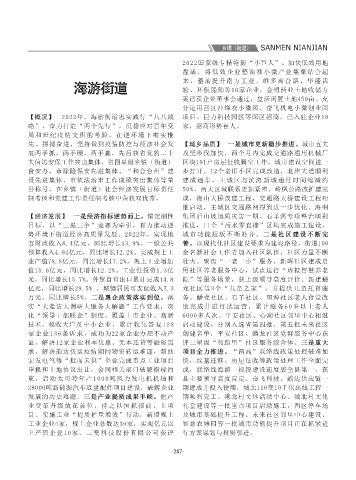 【概况】 2022年,海游街道忠实践行“八八战 项目、巨力科技园区等园区招商,已入驻企业18 周岁以上人员全程接种1.6万人,无疫单元创建成 使用,大湖塘中轴线亮化、悬渚入城口景观提升 主城”的特殊形态,造成“村庄增收本领不高、 “基层治理四平台”,建立综合信息指挥室,设 级。坚持招大引强,签约亿元以上项目1个,春宸 先完成省档案服务农村基层治理试点,相关做法