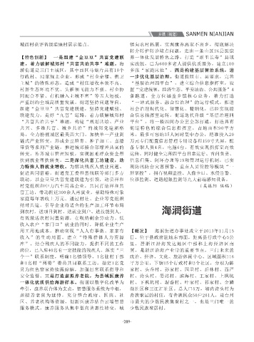 业变革升级放在首位,持之以恒抓招商、上项 礼堂建设等一批重点项目启动施工,西区停车场 豆比拼”“议事厅头脑风暴”等一批创新机制。 部作风效能明显提升。深化清廉海游建设,巩固 牵引,康养联合体为支点,智慧服务系统为中枢, 湖社区和三江汇社区。总人口5万,辖内涛头村为 网格、152个微网格中发展一批“1+3+N”网格成 示范阵地,新时代“枫桥式”退役军人服务站通 资产投资同比增长28.8%,两项指标增速排名均居 【党的建设】 成立船家福、清溪里、云山栖三大 业,名门汽配、东电橡塑、沃明交通设施等5家企 合行动20余次,检查企业300余家,整改各类问题