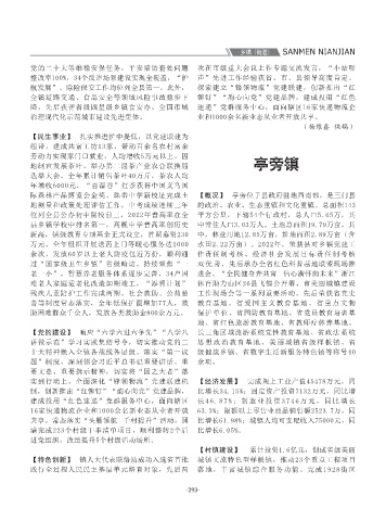 进集体。2022年,镇域实现规上工业总产值 跳山等多处废弃矿山修复,推进虎头山生态修复、 发动靠活动、活动靠文化”的理念,新建4个、提 访代办、“四清三化”调解机制、乡村平安小喇 AAAA级景区乡镇,通过省级旅游度假区资源评估 注重典型引领家风建设,林海伟家庭获得第十