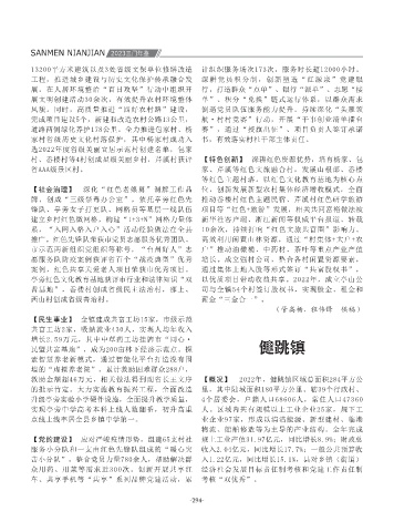SANMEN NIANJIAN 2023三门年鉴 同投资185万元,高质量建设“祥和共富工坊”, 城西村获评省级清廉村居示范点。 镇向农村拓展,实现康养离家不离乡,彻底解决 【经济发展】 全年实现财政总收入7138万元,实 完成整改销号。着力解决矛盾纠纷,全年接收信 关工委、老龄、红十字会、工会、妇联等工作进 【村镇建设】 先后投入1500余万元新建道路3条,