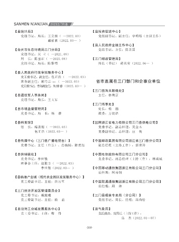 台湾工作办公室 主 任:王爱民 党组书记、主任:郑成川 主 任:赵勤丰 县纪委县监委派驻第三纪检监察组 倪林锋(2022.12— ) 党委书记、常务副校长:杨 诚( —2022.03) 【县交通局】 【三门海事处】