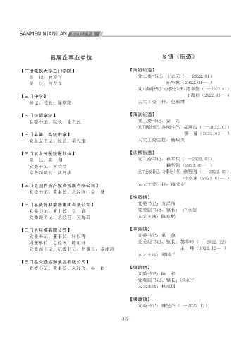 SANMEN NIANJIAN 2023三门年鉴 【委办机构】 王 群 方心挺 叶 翔 叶继将 【县监委】 陈广飞(2022.10— ) 【县委组织部】 县委工作机构 【县委县政府信访局】 【县总工会】 人民团体协会 【县发展和改革局】 【三门县社会治理中心】