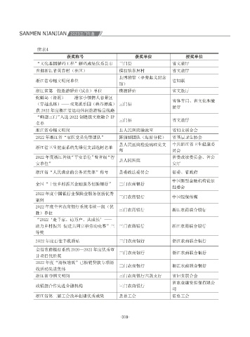 SANMEN NIANJIAN 2023三门年鉴 【委办机构】 王 群 方心挺 叶 翔 叶继将 【县监委】 陈广飞(2022.10— ) 【县委组织部】 县委工作机构 【县委县政府信访局】 【县总工会】 人民团体协会 【县发展和改革局】 【三门县社会治理中心】