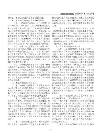 中华优秀传统文化,以文化人、以文育人、以文 质文化生活圈”覆盖率达到100%,图书馆乡镇分 程。建设一批融文化、旅游等功能为一体的综合文 作项目激励机制,完善全周期文艺精品服务机制。 大政府购买公共文化服务力度。支持人员配备不足 作用。健全完善文体下派员运行机制,根据需要向 快改善三门农村总体形象,擦亮美丽三门底色;实 局、产业结构、村庄形态迭代升级;通过村集体或 以上的行政村达到年集体经济总收入100万元且经 情况纳入年度考核。 诚履行党章赋予的职责,坚持稳中求进工作总基调, 关切、解决群众困难,切实增强人民群众获得感幸