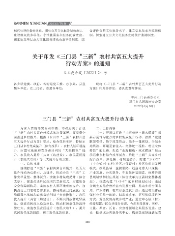 三门县人民政府办公室 (七)提升公共文化服务标准。按照省、市统 擦亮“文化超市”“三员下派”等文化品牌,各乡 以文化基因解码工程为基础,着力打造浙江省文化 (二十四)加强组织领导。各乡镇(街道)、 各乡镇党委、政府,各街道党工委、办事处,县直 现将《三门县“三新”农村共富五大提升行动 文乡村+善治乡村”建设,开展4个省级未来乡村建 行动培训0.91万人次,农民形象焕新行动培训 2022年9月28日