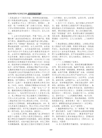 面,并尽量细化考评项目。其中,工作业绩占60% 每年6月底、12月底分别形成半年度、年度评议分 度考核定为优秀等次,并作为县委选人用人的重要 落实、赢得群众满意。 强县、创新强县首位战略,吸引更多的人口人才来 元以上且掌握关键核心技术的技术技能人员,签订 实施招用高校毕业生企业薪酬补贴,对2022年1月 城,融入台州市“新能源城、新材料城、新医药健 上,县域就诊率达到90%以上,每千人床位数达到 城、鲜甜港城”品牌(责任单位:县委宣传部、县
