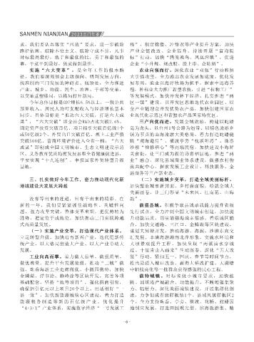 金2.51亿元、降本减负7.7亿元,“万名干部助万 拟养老院成为全省共富最佳实践,婚俗改革成为 民民主基层单元、县政协“助业共兴、助力共 好特色发展之路,打造了鲜甜三门、能源之城, 果”,“六大突破”即全社会R&D占比突破2.6%、 三产向优而进。发展全域旅游,构建以蛇蟠 开放,为三门发展释放更多红利、赢得更大主动。 索教育评价改革,推动中高考成绩再创新高。扎 领域综合治理,加强粮食、能源等安全保障,坚