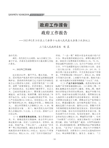 城建设,承压奋进、锐意拼搏,较好地完成了各 转型,完成70家企业数字化改造,橡塑制品行业 (四)改革开放深入推进。体系化规范化推 岸线修复、海游港综合整治、石羊溪专项整治、 在加快推动经济社会发展的同时,我们高度 二、2023年政府主要工作 以上,一般公共预算收入、居民人均可支配收入 企业稳产促产,确保规上工业产值突破500亿元。