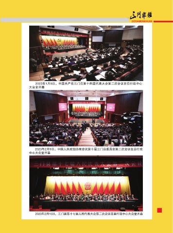 2023SANMENNIANJIAN 2023年1月9日,中国共产党三门县第十四届代表大会第二次会议在县行政中心 大会堂开幕 2023年2月9日,中国人民政治协商会议第十届三门县委员会第二次会议在县行政 中心大会堂开幕 ̾ 2023年2月10日,三门县第十七届人民代表大会第二次会议在县行政中心大会堂开幕