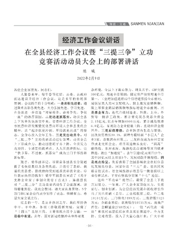 三是惠企政策体系的覆盖面和针对性不够。政策 指标增速冲向全市前列,领跑北三县,干出三门 中找到落脚点。要围绕政策激励谋,当前,特别 科创“飞地”建设,打造“孵化在县外、转化在 国,RCEP对我们来讲是巨大政策红利,比如,我 全社会真心爱护、真情善待民营企业,让更多创 一是全员参战。“三提三争”就是发展的主 同志们,今年是虎年,虎是勇敢和力量的象