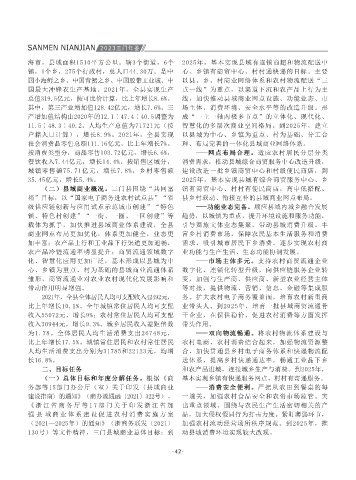 线干部、农村指导员、大综合一体化人员等均纳 行1—3个月回炉淬炼。建立动态三方帮扶机制, 平竞争审查全覆盖。强化领导小组和县联席会议 竞争政策制度和法律法规列入年度普法工作要点 2021年,全县全体居民人均可支配收入42492元, 务。扩大农村电子商务覆盖面,培育农村新型商 铁路健跳支线前期工作,提升集疏运条件,开展 村便利店。2022—2025年,支持40家便利店、夫 根据《三门县商务发展“十四五”规划》《三 (县商务局 供稿)