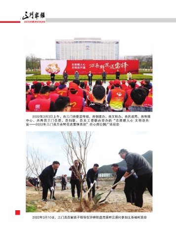 2023SANMENNIANJIAN 2022年3月3日上午,由三门县委宣传部、县创建办、县文明办、县民政局、县传媒 中心、共青团三门县委、县妇联 、 县 关 工 委联合举办的“志愿暖人心 文明助共 富——2022年三门县万朵鲜花送雷锋活动”在心湖公园广场启动 ́ 2022年3月10日,三门县四套班子领导在沙柳街道清溪畔云溪村参加义务植树活动