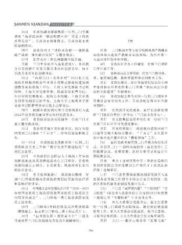 4日 县水产技术推广站入选农业农村部办公 24日 县政协组织文化、艺术、新闻、体育活 同日 副市长管文新调研三门县“三新”共 日前 三门核电有限公司公众科普展厅入选 同日 省人大常委会委员、社会建设委主任 行到三门调研科创工作。 旧改类未来社区创建项目。 5日 省林业局总工李荣勋一行到三门指导林、 18日 省十五次党代会精神市委宣讲团报告 现场推进大会在横渡举行。 27日 陈晨接待晶澳太阳能科技股份有限公 特邀人士界别活动组委员到三门开展“助力共同