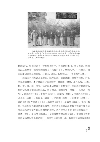 王理孚、刘景晨等(从左到右)。园内可见花木繁茂,刘景晨手持一枝
