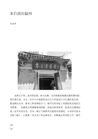 朱自清在温州 包连续 这座五开间二进合院民居,砖木结构,且有浓郁的晚清民国时期风格。 现代散文家、诗人、清华大学教授朱自清先生在温州中学任教时的住所, 据说就在这里。推开古朴清幽的大门,就可以看到近 2 米高的朱自清先生 的塑像。一张棱角分明清晰俊朗的脸,高高的鼻梁架着一副老式近视镜衬 着一丝不苟的头发,很有一种正气凛然且清新脱俗的感觉。小学时代课本 里的《绿》,让我第一次认识了朱自清先生,那飘逸且明快的文字一直伴 146 147