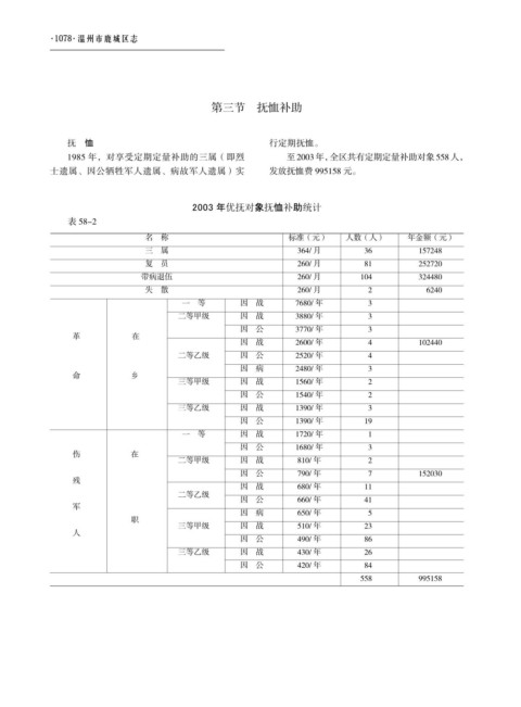 1985 年,对享受定期定量补助的三属(即烈 至 2003 年,全区共有定期定量补助对象 558 人, 疗补助费 2.8 万元,补助人次 40 余人。