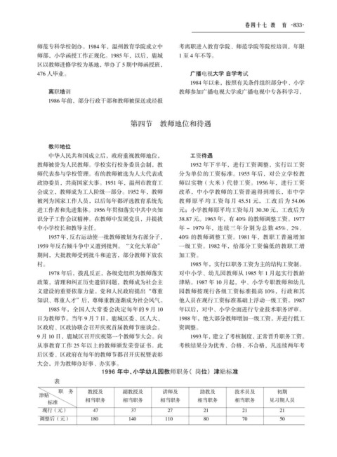 州市教育学院开设高师专科班、初中师资培训班、 年,鹿城区教委印发《关于教师参加高师进修实行 被列为国家工作人员,以后每年都评选教育系统先 教师原平均工资每月 45.51 元,工改后为 54.06