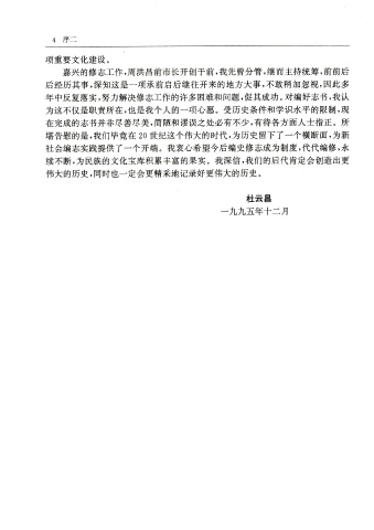 嘉 兴 的 修 志 工 作 ,周 洪 昌 前 市 长 开 创 于 前 ,我 先 曾 分 管 ,继 而 主 持 统 筹 ,前 前 后