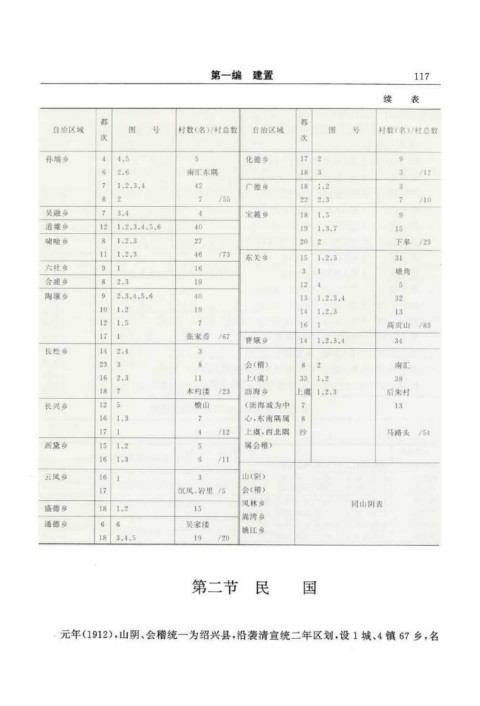 续 表 第 二 节 民 国 元年(1912) ,山阴、会稽统一为绍兴县,沿袭清宣统二年区划,设1城、4镇67乡,名