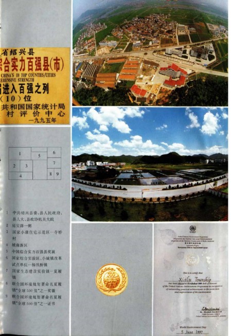 1 中共绍兴县委、县人民政府、 县人大、县政协机关大院 2 延安路一侧 3 国家小康住宅示范区-寺桥 村 4 城南新区 5 中国综合实力百强县奖匾 6 国家综合实验区、小城镇改革 试点单位-杨汛桥镇 7 国家生态建设实验镇-夏履 镇 8 联合国环境规划署命名夏履 镇“全球500佳”之一奖徽 9 联合国环境规划署命名夏履 镇“全球500佳”之一证书