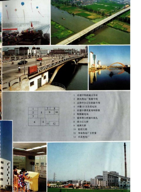 1 在建中轻纺城火车站 2 新风热电厂铁路专线 3 县协作办公室铁路专线 4 木栅50万伏变电所 5 在建中萧甬复线柯桥段 6 柯桥邮电局 7 银皋埠大桥通车典礼 8 西小江大桥 9 城南大桥 10 轻纺大桥 11 华舍热电厂主控室 12 兴亚热电厂