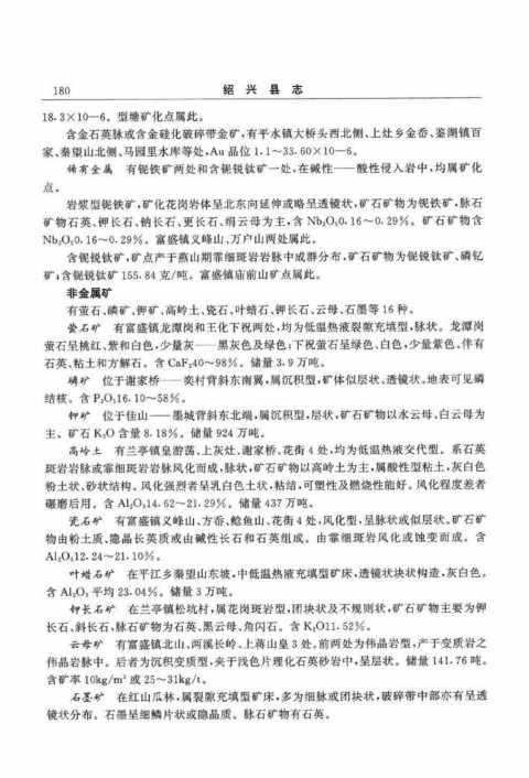 稀有金属 有铌铁矿两处和含铌锐钛矿一处,在碱性——酸性侵入岩中,均属矿化