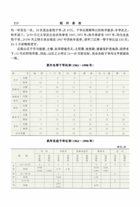 秋冬居三。≥70天之大旱发生在伏秋季有1967、971年;秋冬季者有1977年,均为全县