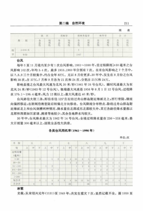 每 年 5至 11月 境 内 至 少 有 1次 台 风 影 响 。 1961~ 1990年 , 受 过 程 降 雨 ≥ 30毫 米 之 台