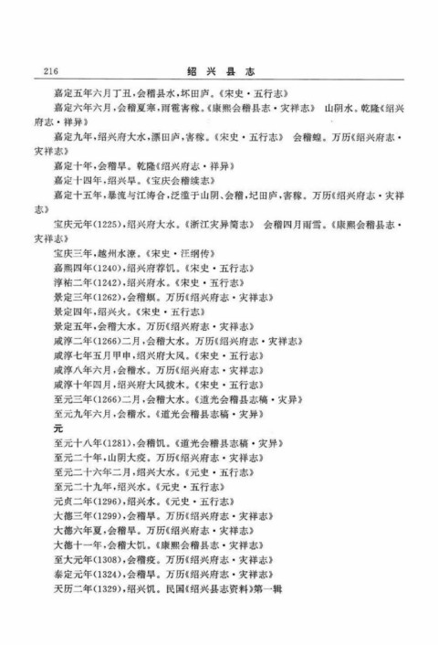 宝庆元年(1225),绍兴府大水。《浙江灾异简志》会稽四月雨雪。《康熙会稽县志·