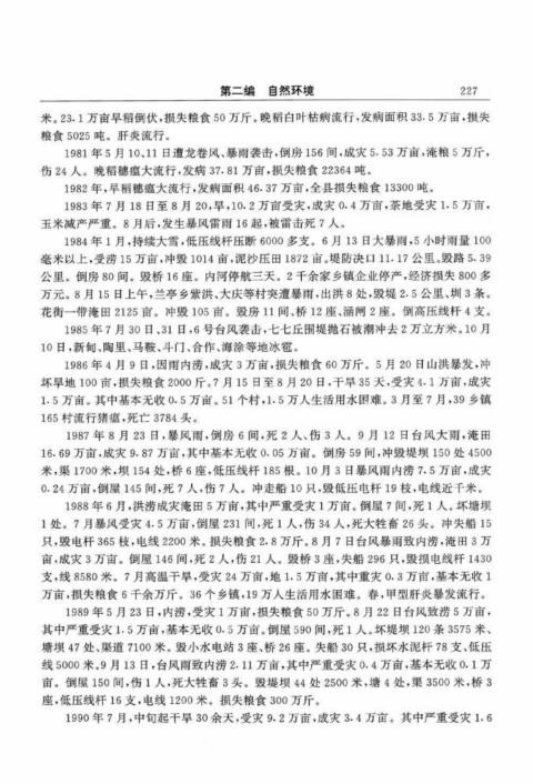 1987年 8月 23日 , 暴 风 雨 , 倒 房 6间 , 死 2人 、 伤 3人 。 9月 12日 台 风 大 雨 , 淹 田
