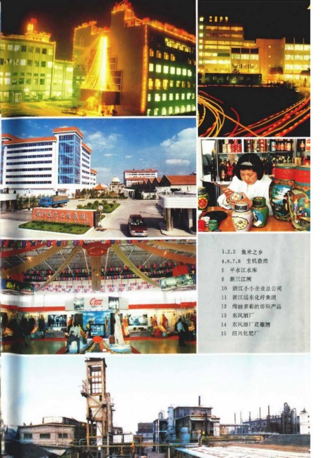1、2、3 鱼米之乡 4、6、7、8 生机盎然 5 平水江水库 9 新三江闸 1 0 浙江小小企业总公司 11 浙江远东化纤集团 12 绚丽多彩的纺织产品 13 东风酒厂 14 东风酒厂花雕酒 15 绍兴化肥厂