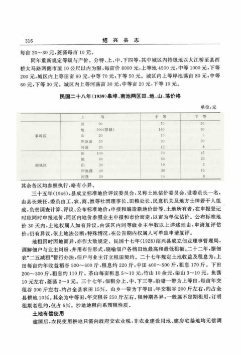 地租因时因地而异,亦作大致规定。民国十七年(1 9 2 8 )绍兴县成立佃业理事管理局,