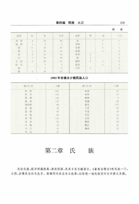 续 表 1993年各镇乡少数民族人口 第 二 章 氏 族 志设氏族,能详侨籍隐寓,清流别源,关系乡里文献甚巨。《嘉泰会稽志》有氏族一门, 山阴、会稽县志向无此目。新编绍兴县志专立此章,以综观一地氏族变迁与兴衰之关联。
