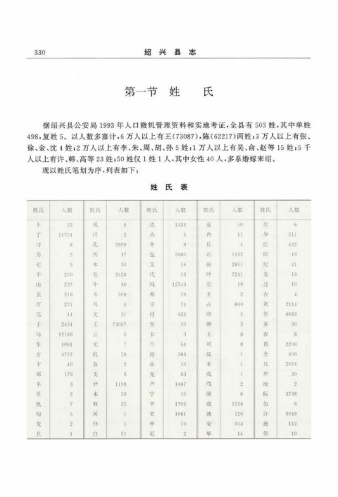 第 一 节 姓 氏 据绍兴县公安局1993年人口微机管理资料和实地考证,全县有503姓,其中单姓 498,复姓5。以人数多寡计,6万人以上有王(73087),陈(62217)两姓;3万人以上有张、 徐、金、沈4姓;2万人以上有李、朱、周、胡、孙5姓;1万人以上有吴、俞、赵等15姓;5千 人以上有许、韩、高等23姓;50姓仅1姓1人,其中女性40人,多系婚嫁来绍。 现以姓氏笔划为序,列表如下: 姓 氏 表