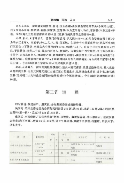 民国时,绍兴县修志委员会调集民间谱牒2 5 5 部,达9 8 氏,采访1 2 3 族,辑入《绍兴县