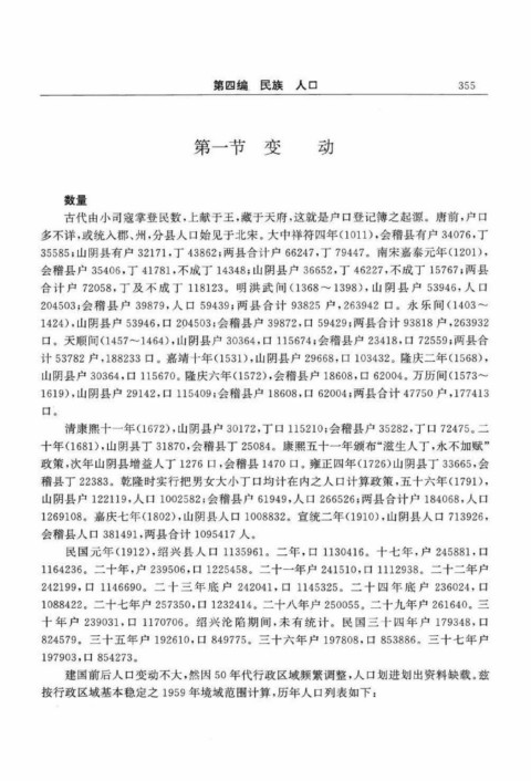 204503;会稽县户39879,人口59439;两县合计93825户,263942口。永乐间(1403~