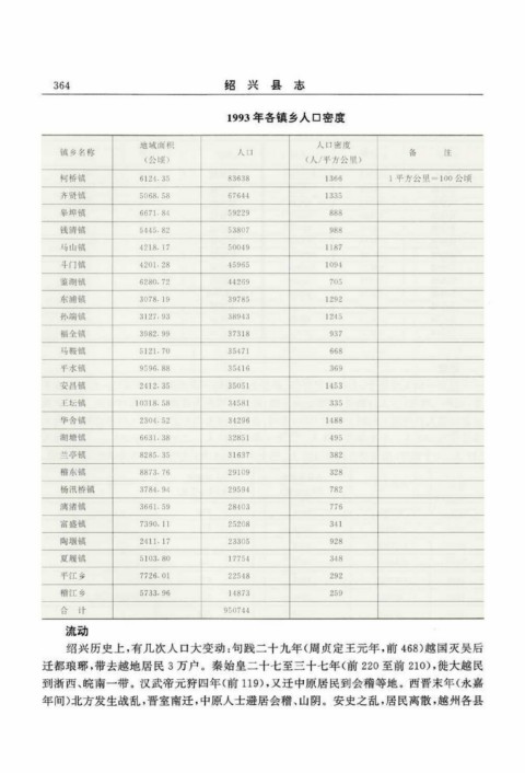 1993年各镇乡人口密度 流 动 绍兴历史上,有几次人口大变动:句践二十九年(周贞定王元年,前468)越国灭吴后 迁都琅琊,带去越地居民3万户。秦始皇二十七至三十七年(前220至前210),徙大越民 到浙西、皖南一带。汉武帝元狩四年(前119),又迁中原居民到会稽等地。西晋末年(永嘉 年间)北方发生战乱,晋室南迁,中原人士避居会稽、山阴。安史之乱,居民离散,越州各县