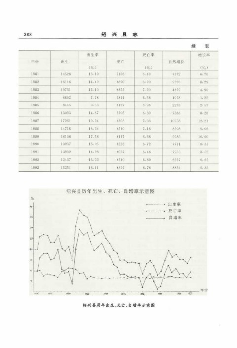 续 表 绍兴县历年出生、死亡、自增率示意图