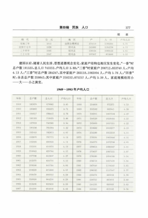 续 表 建国以后,随着人民生活、思想道德观念变化,家庭户结构也相应发生变化。“一普”时 总户数191523,总人口743352,户均人口3.88;“二普”时家庭户206712,53740人,户均 8 4.13人;“三普”时总户数284247,其中家庭户283118,065004人,户均3.76人;“四普” 1 时,全县总户数259 842,其中家庭户258232,75237人,户均3.39人。家庭规模经历小 8 ——大——小之演变。 1949~1993年户均人口