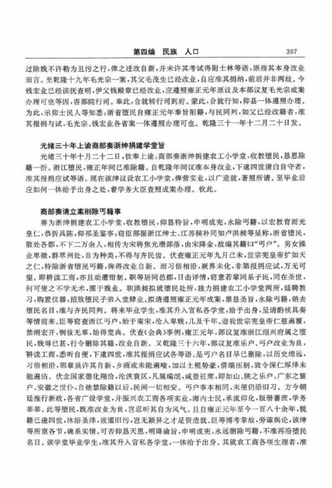 光绪三十年十月二十二日,钦奉上谕:商部奏浙绅捐建农工小学堂,收教堕民,恳恩除