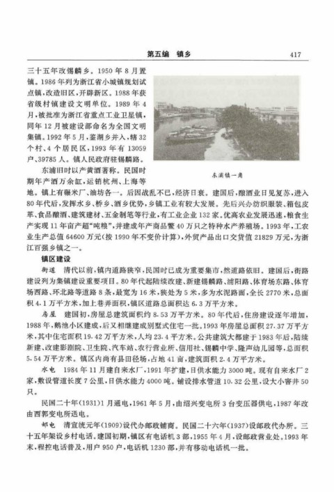 十五年架设乡村电话。建国初期,镇区有电话机3部,1955年4月,设邮政营业处。1993年