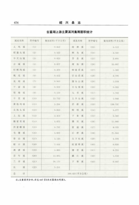 古鉴湖上游主要溪河集雨面积统计 注:主要溪河分布,详见447页《东汉鉴湖水利图》。