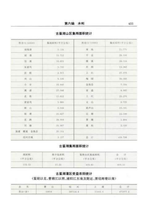 古鉴湖山区集雨面积统计 古鉴湖集雨面积统计 古 鉴 湖 灌 区 受 益 农 田 统 计 (鉴湖以北、曹娥江以西、浦阳江东南及附近、萧绍海塘以南)